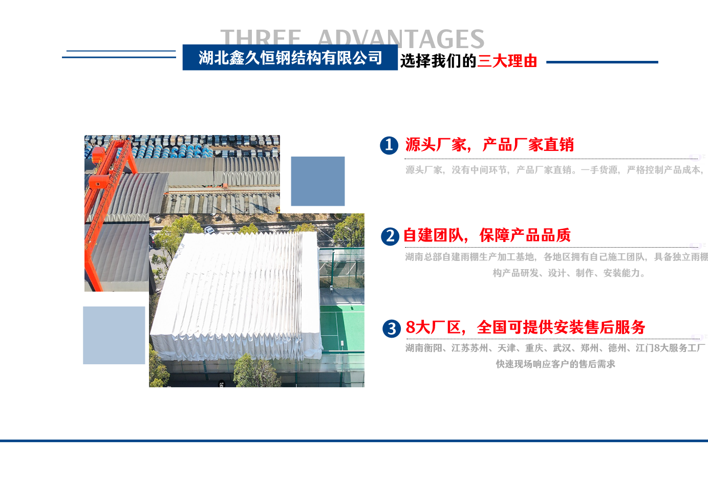湖北鑫久恒鋼結構有限公司是一家電動雨棚、膜結構車棚研發,生產銷售,施工安裝于一體的專業鋼結構科技公司,主要產品有伸縮雨棚,電動雨棚,膜結構車棚等?! 『系貐^職員目前有80多人,占地面積20000平方米,廠房面積15600平方米,配備先進的生產流水線,使每件品質產品的堅實基礎。 公司在蘇州、天津、重慶、武漢、德州、烏魯木齊、江門均設有服務工廠,總人員共300多人,擁有專業的技術團隊,配備先進的設備和流水線生產,產能高,貨源充足,發貨速度快,服務區域廣。 移動伸縮棚適用于通道臨時倉儲、戶外運動遮陽、污水池遮蓋、能源交通、熱力化工、礦山、船舶制造及市政建設、物流、碼頭等領域的構件制作加工,成品半成品存放、倉庫、野外儀器設備操作用房等。尤其是對工廠發貨、倉儲臨時遮雨防嗮,梅雨期較長、建設周期較短的工程施工等特別適用。還可根據用戶需求量身定制、適合企業所需不同款式的產品。 我公司堅持“誠信社會為本,客戶滿意為榮”的經營理念,做到質量把控,嚴格管理,精益求精,恪守承諾。使鑫久恒逐步走向成熟,其系統化、專業化日趨完善。以專業的技術、科學的管理,更高的產品質量,優良的企業信譽,真誠的客戶服務,靈活多樣的經營方式和務實創新的企業精神愿與社會各界攜手合作,為推動智能鋼結構建筑事業的發展而不斷努力。...